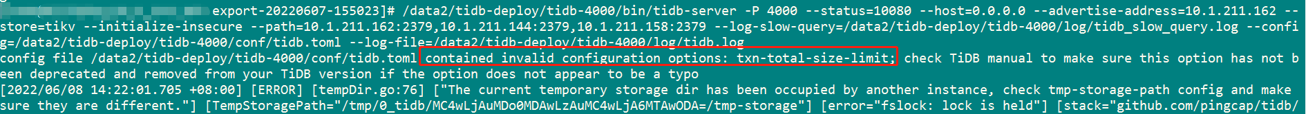 你可以i先 edit-config 看看集群配置写的是对的不,然后reload一下,只针对tidb做reload就行,然后再看tidb启动的时候有没有这个报错。