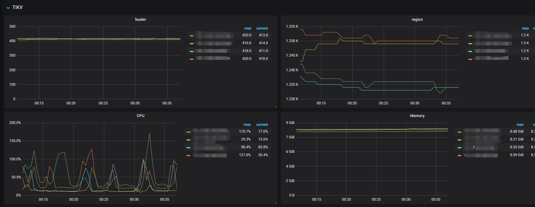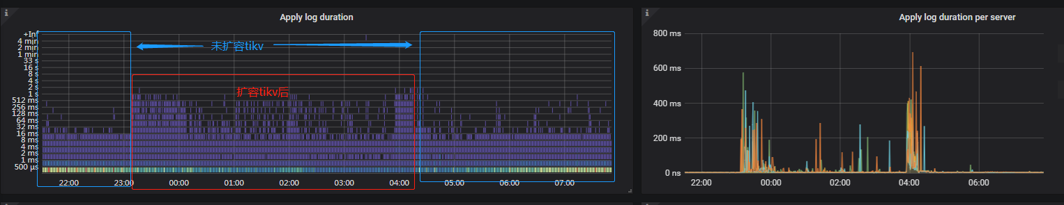用的是tidb 4.0.10的版本,目前是3个节点,想增加tikv的节点数,把新的节点加进去以后,Apply log duration从32ms-64ms增加到128ms-256ms,Append log duration、commint log duration的时间也跟着翻了好几倍,一开始以为只是在平衡数据期间会这么慢,但是数据平衡完了以后还是这么慢,请问大概是什么原因导致的,应该怎么排查。