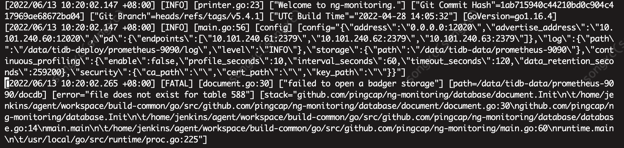 手动去把 ng-monitor 所在机器上的 ng-monitoring 的 data 目录删除吧,看日志好像是 /data/tidb-data/prometheus-9090/docdb , 直接 删除这个目录后重启 ng-monitoring 看看