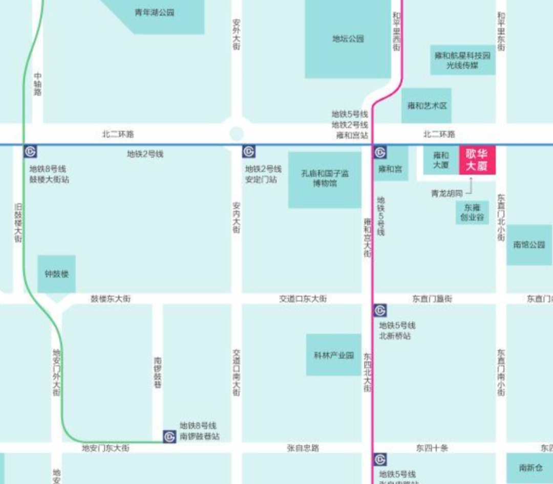 交通:地跌 2 号线、5 号线雍和宫地铁站。歌华大厦南北两侧皆有停车场,方便停车。