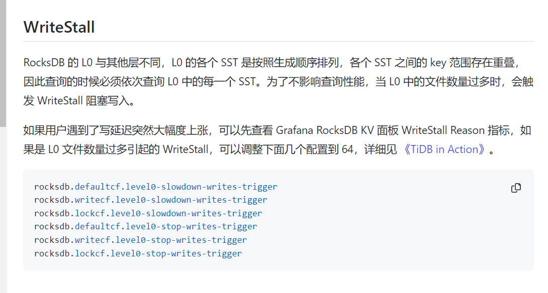 [RocksDB 简介 | PingCAP Docs]除了这些我记得还有一些writestall的问题和解决方案,你先看下能不能解决你的问题(https://docs.pingcap.com/zh/tidb/stable/rocksdb-overview#writestall)