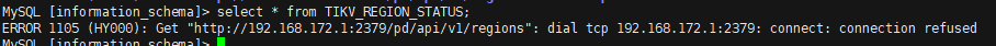 PD集群有3个节点,测试机房宕机会丢失一个节点,查询数据表均正常,但是查看region分布时,执行sql select * from TIKV_REGION_STATUS;会失败,显示