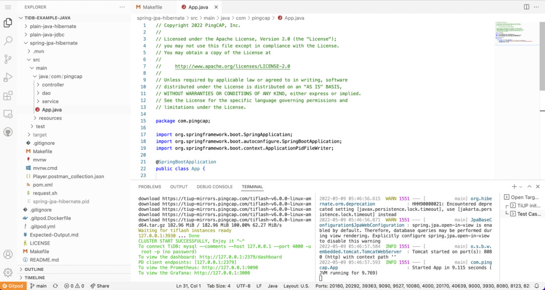 我们基于 Gitpod,为没有条件部署 TiDB 或开发 SDK 环境的开发者,提供了一个 TiDB Golang 示例,打开这个链接,你就可以直接从你的浏览器或桌面 IDE 启动一个远程的 TiDB 开发环境,快速体验 TiDB 的能力。