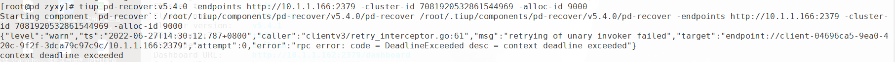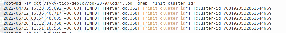 最后因为 cluster ID 不一致,搜索文档 https://docs.pingcap.com/zh/tidb/v5.4/pd-recover 根据文档去找旧的集群中的cluster ID 与 alloc-id