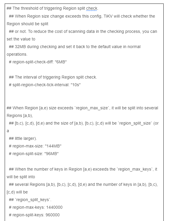 3.0版本的参数,region-split-check-diff: "6MB” ,split-region-check-tick-interval: “10s”,意思是每隔10s 运行 check,发现 region 的大小增长超过6MB ,并且满足region-max-size: “144MB” 或者 region-max-keys: 1440000 这两个条件之一时触发 split 操作,split 之后,新的 region 大小是96MB,max-keys 是960000。
