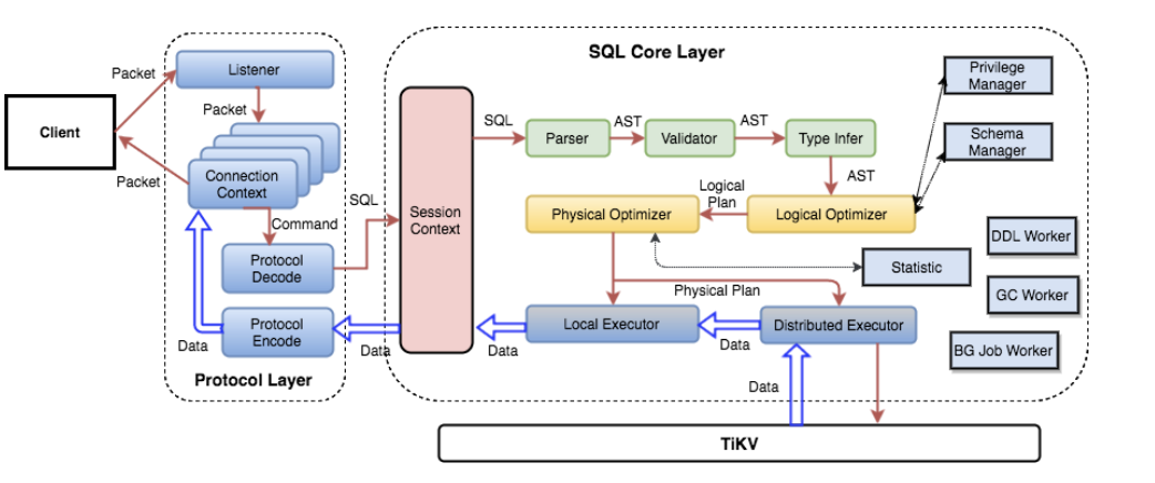 tidb 分析该请求进行 Mysql 协议解析和转换;
