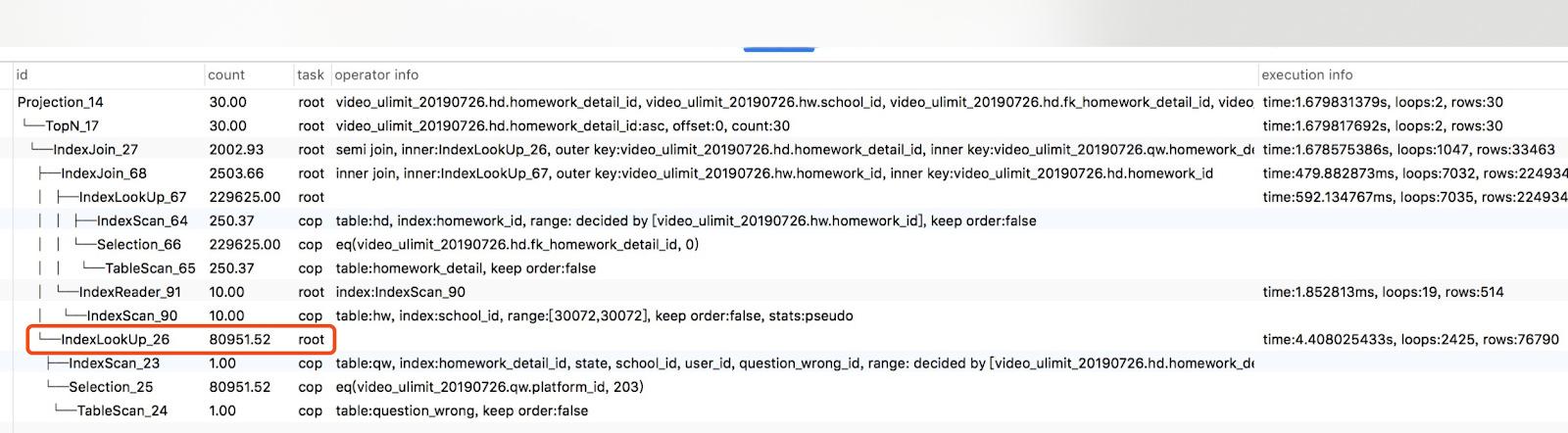 Grafana Metrics 提供了 由 AST 解析成查询计划所消耗的时间,正常情况下应小于 30ms。平均执行计划生成时间为:tidb_session_compile_duration_seconds_sum/tidb_session_compile_duration_seconds_count