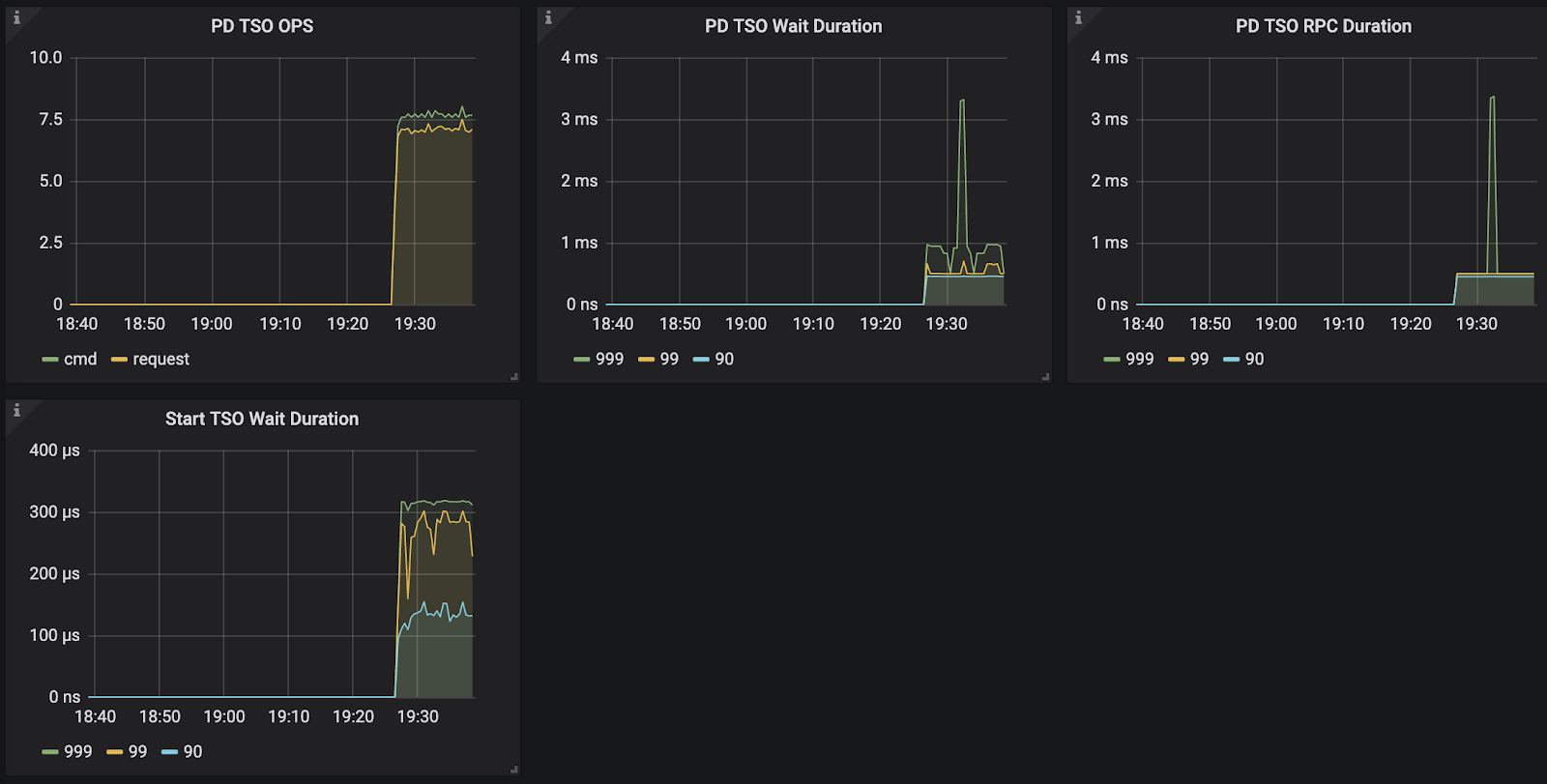 目前系统没有对第一个阶段设置相应的监控信息,这个过程通常很快,除非 channel 满了,否则 GetTSAsync 函数很快返回,而 channel 满表示 RPC 请求延迟可能过高,所以可以通过 RPC 请求的 Duration 来进一步分析。