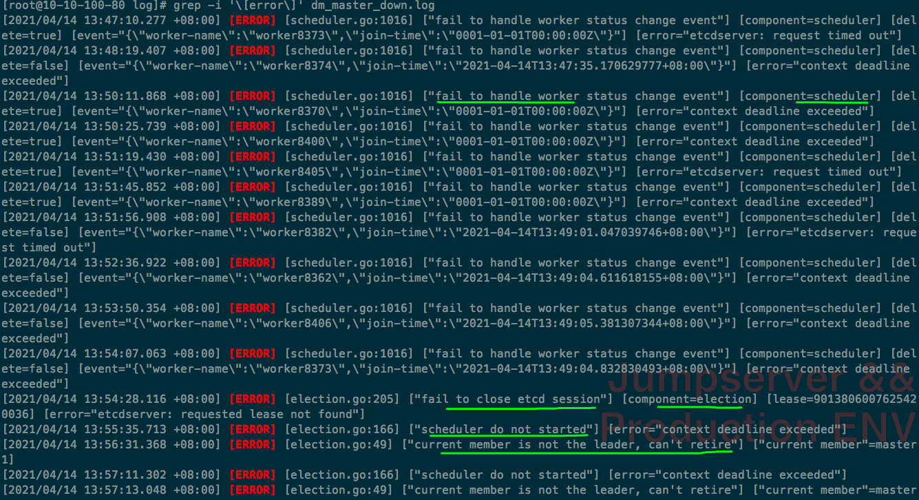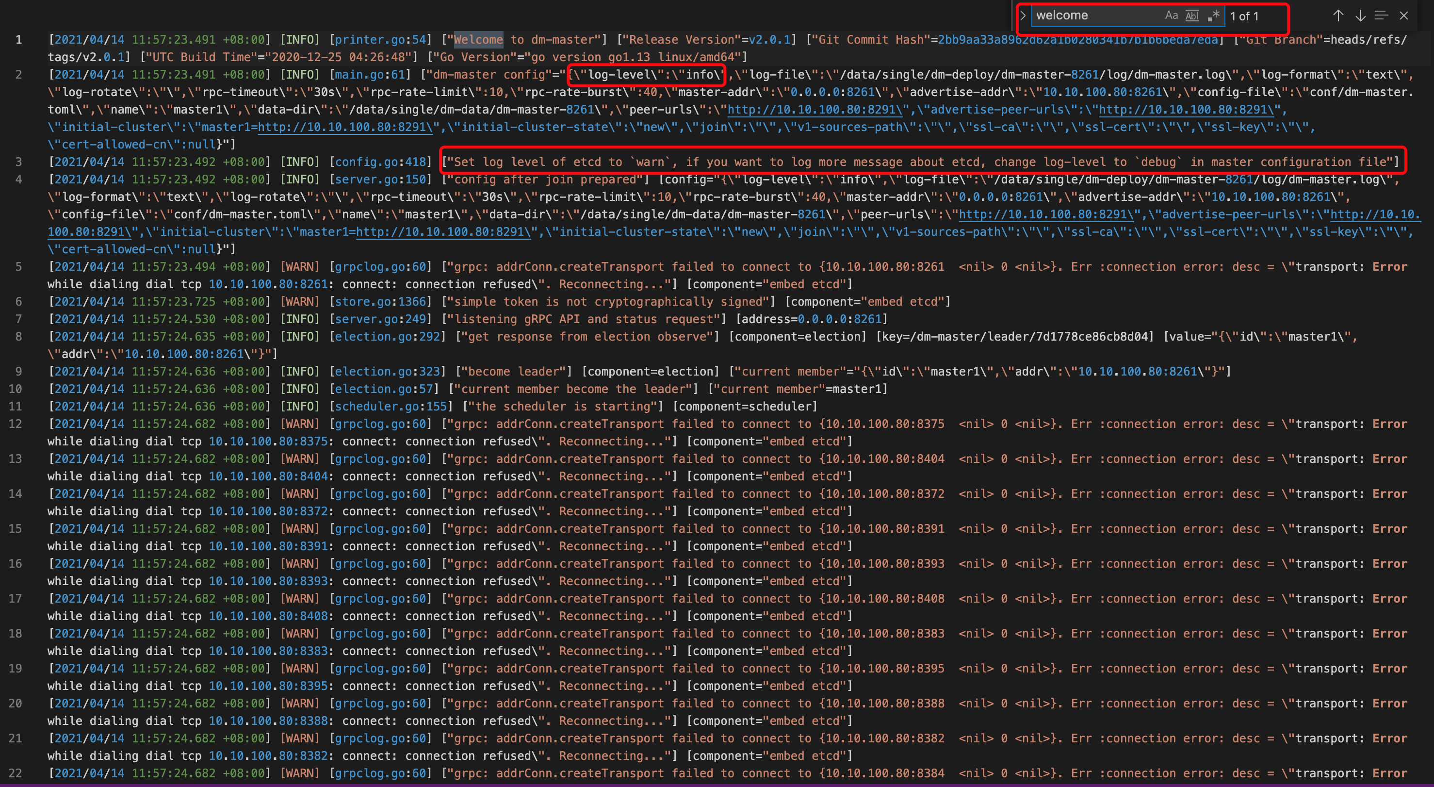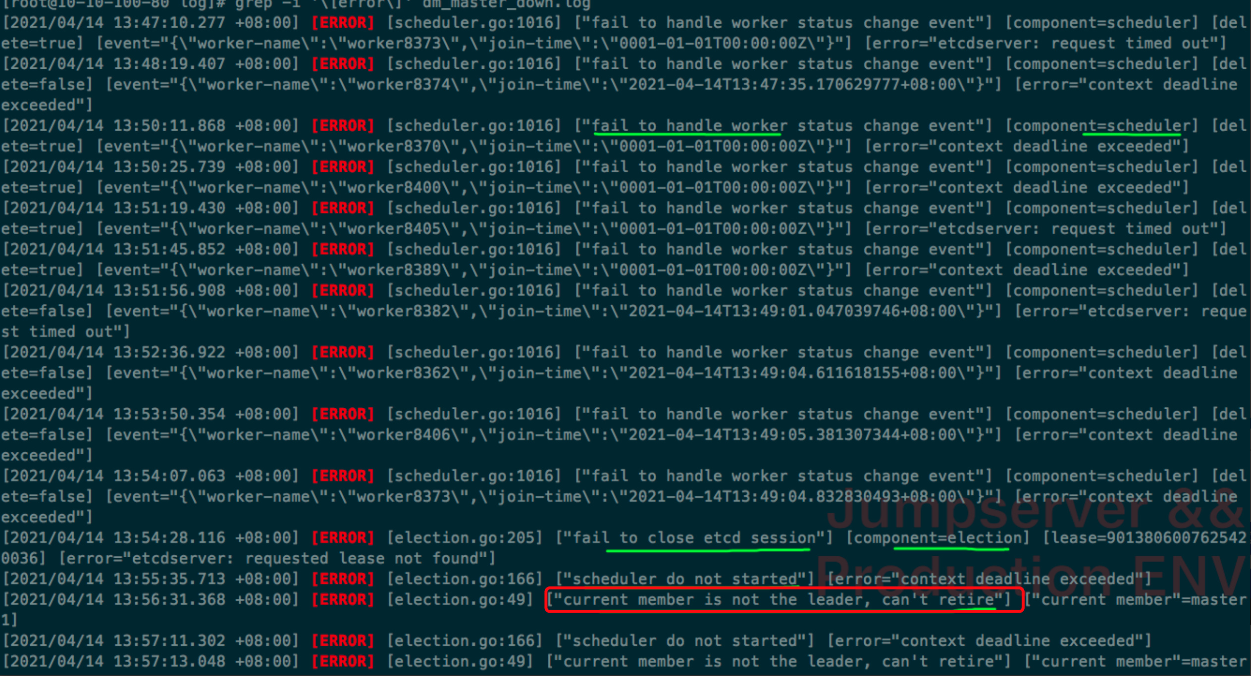 我重启了 DM 集群,然后开启 dm-master 的 debug 日志。后来复现了这个问题,过滤到 error 级别的日志,主要有: