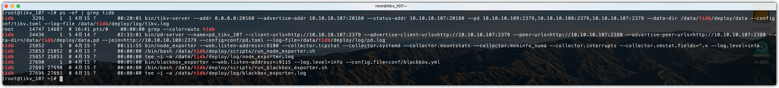 请问是后来把 pd 扩容到了 107.108,109 吗? 方便看下 107 上 tidb 的进程都有哪些吗? 如果是 tidb 用户,ps -ef | grep tidb 反馈下结果,重点看下 node 和 black 进程有几个,多谢。