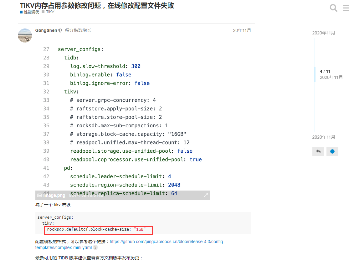 我按照这种 storage.block-cache.capacity: 5GB 改的,重启了tikv节点,目前内存是降下来了,不知道配置对不对会不会生效