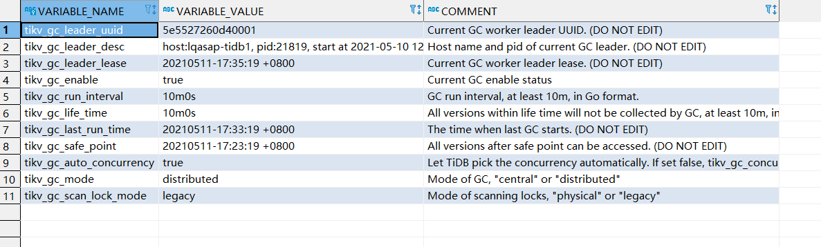 select * from mysql.tidb where variable_name like 'tikv_gc%';