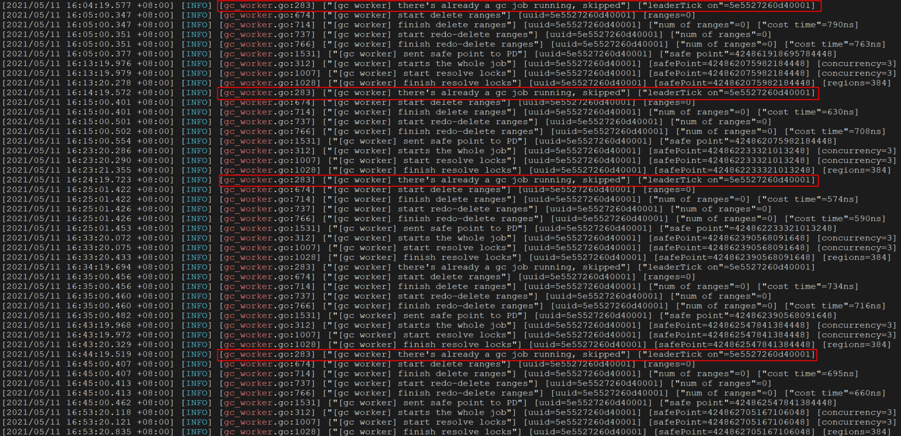 没有gc safepoint blocked by a running session占用的情况。但是有很多"[gc worker] there’s already a gc job running, skipped"