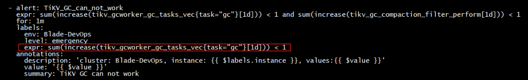sum(increase(tikv_gcworker_gc_tasks_vec{task=“gc”}[1d])) < 1 and sum(increase(tikv_gc_compaction_filter_perform[1d])) < 1