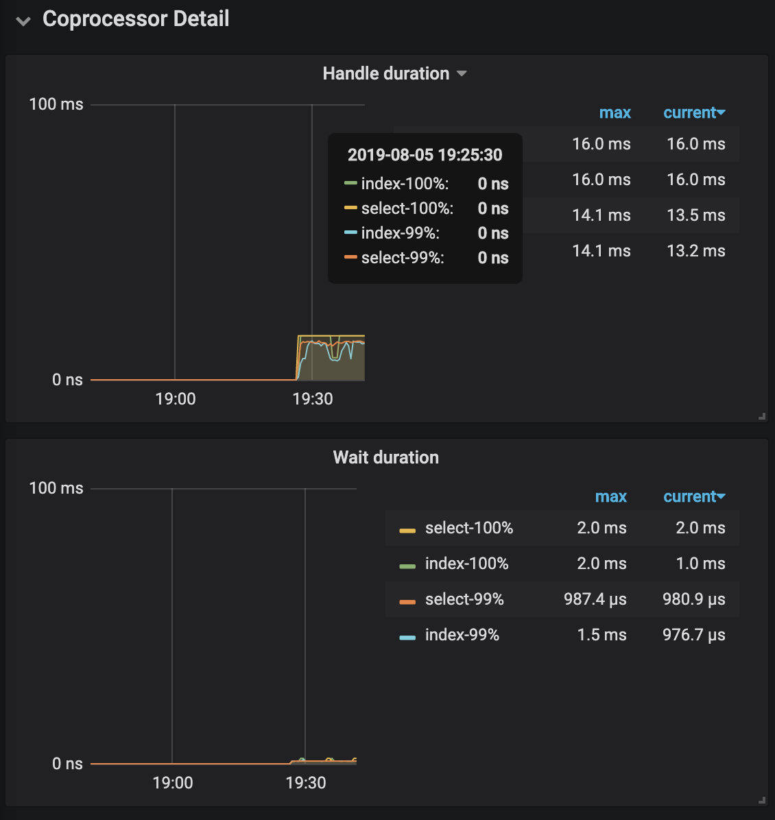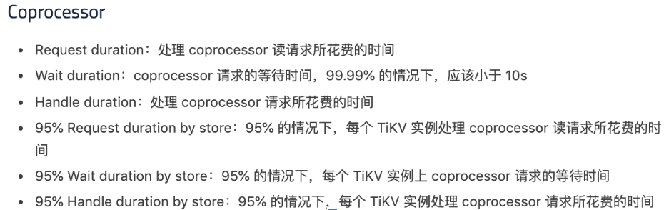 - coprocsssor wait duration 建议 99%的等待延迟应该在50ms以内。如果这个指标过高一般意味着 coprocessor 处于繁忙状态。