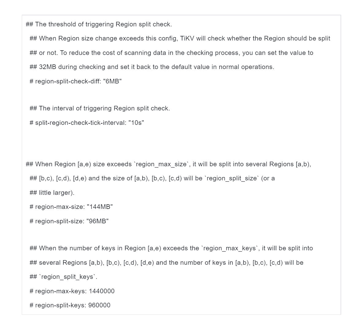 每隔10s 运行 check,发现 region 的大小增长超过6MB ,并且满足region-max-size: “144MB” 或者 region-max-keys: 1440000 这两个条件之一时触发 split 操作,split 之后,新的 region 大小是96MB,max-keys 是960000。