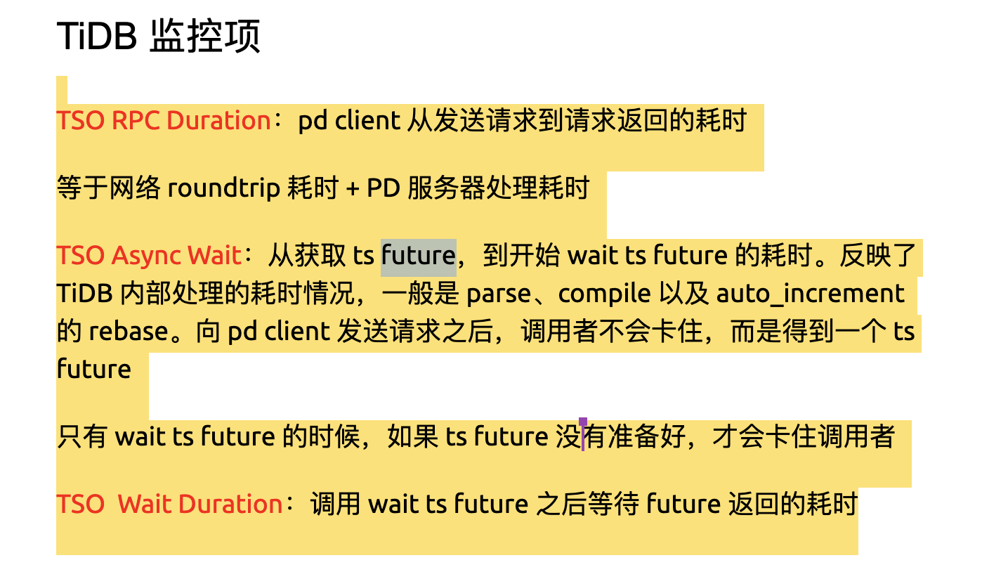- PD TSO Wait Duration: 我们 C可能拿到一个 tsFuture 之后,很快做完 Parse 和 Compile 的过程,这个时候去调用 tsFuture.Wait(),但是这个时候 PD 的 TSO RPC 还没有返回,我们就需要等,这个时间反应的是这一段的等待时间。