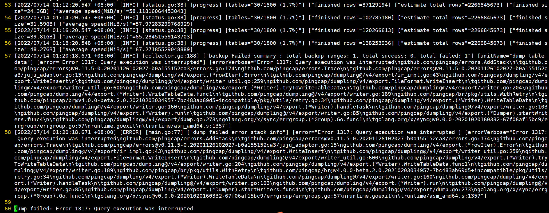 这个集群是是第一次跑备份,之前没备过。 集群运行了很久了。腾讯云主机,内网通讯没异常,晚上22点之后就没量了。 备份重新跑了几次,始终卡在这个报错上,跑个10几分钟左右。