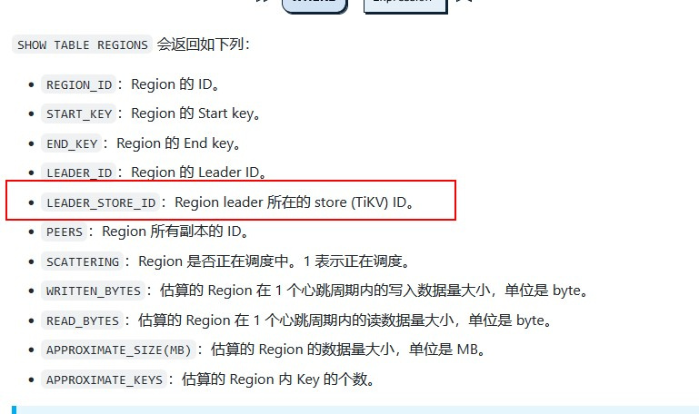 - SHOW TABLE REGIONS:查看表的 region 的 TiKV Leader 节点 id