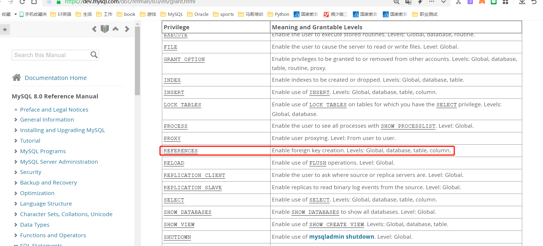 grant all 权限太大了,不利于权限管控。grant ref 在mysql里就支持,可以参考下mysql官档。