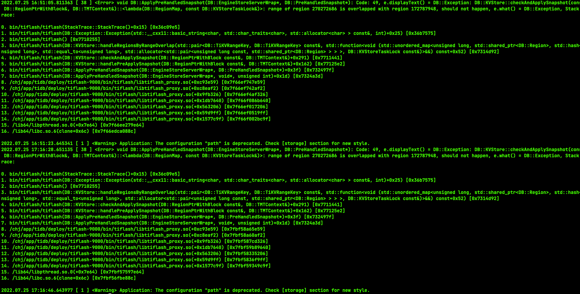 DB::RegionPtrWithBlock&, DB::TMTContext&)::<lambda(DB::RegionMap, const DB::KVStoreTaskLock&)>: range of region 270272686 is overlapped with region 172787948, should not happen, e.what() = DB::Exception, Stack t