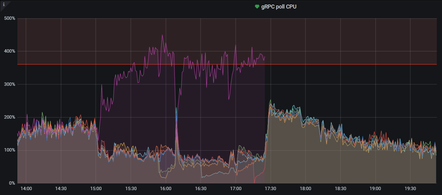 这个节点的cpu配置比其他kv的更好,故障期间内存正常,磁盘容量不超60%、io使用率下降,io量下降,网络流量下降(我理解这些下降,因为流量下降),异常点:cpu使用率比其他正常的6个kv节点高很多;