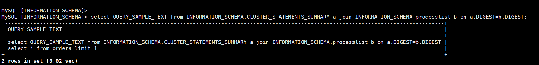 select QUERY_SAMPLE_TEXT from INFORMATION_SCHEMA.CLUSTER_STATEMENTS_SUMMARY a join INFORMATION_SCHEMA.processlist b on a.DIGEST=b.DIGEST;