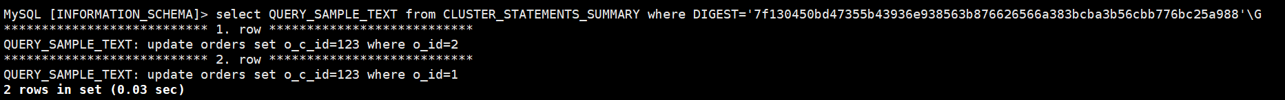 select query_sample_text from information_schema.cluster_statements_summary where digest=‘xxx’;
