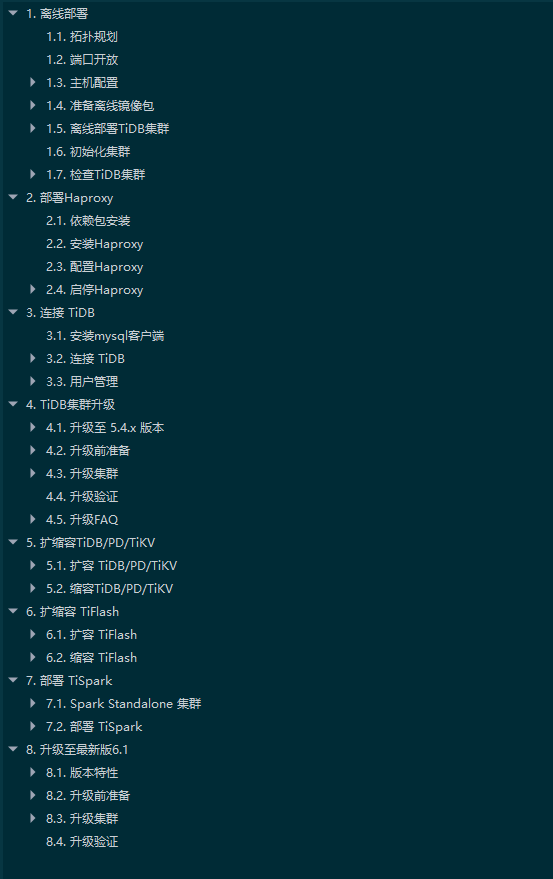 TiDB v5.3.0->v5.4.2->v6.1.0,及扩缩容文档,因字数(120000)超限,以附件形式上传。文档目录如下图所示: