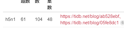 | h5n1 | 61 | 104 | 48 | 博客 - TiKV主要内存结构和OOM排查总结 | TiDB 社区 、 博客 - 我和TiDB的故事 | 遇上你是我的缘 | TiDB 社区 | 445 | 60 | 505 | 1 |