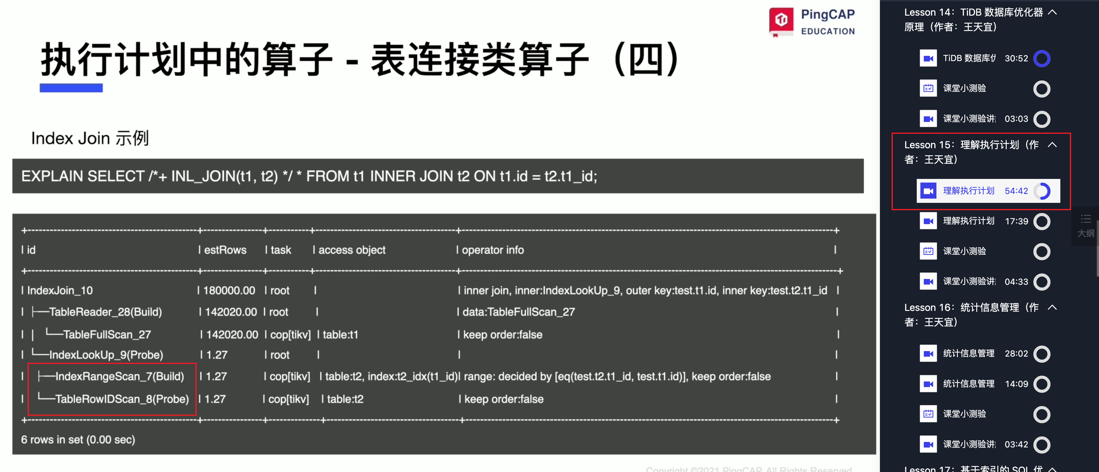 课程 Module5-Lession15-“理解执行计划”一课的46分08秒处,视频讲解有误。视频中描述IndexLookup索引读,无需回表。但是,根据课件内容,如图所示。