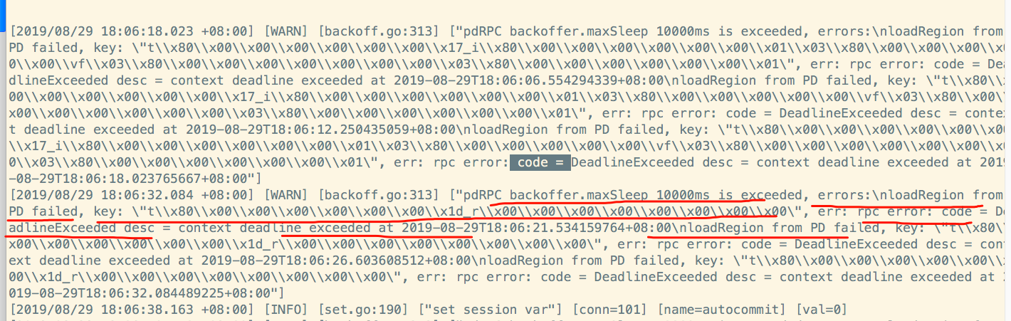2338028 [2019/08/30 04:07:18.820 +08:00] [ERROR] [util.rs:287] [“request failed, retry”] [err=“Grpc(RpcFailure(RpcStatus { status: RpcStatusCode(4), details: Some(“Deadline Exceeded”) }))”]
