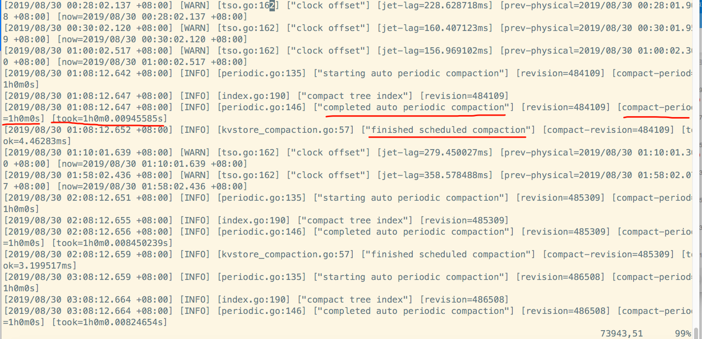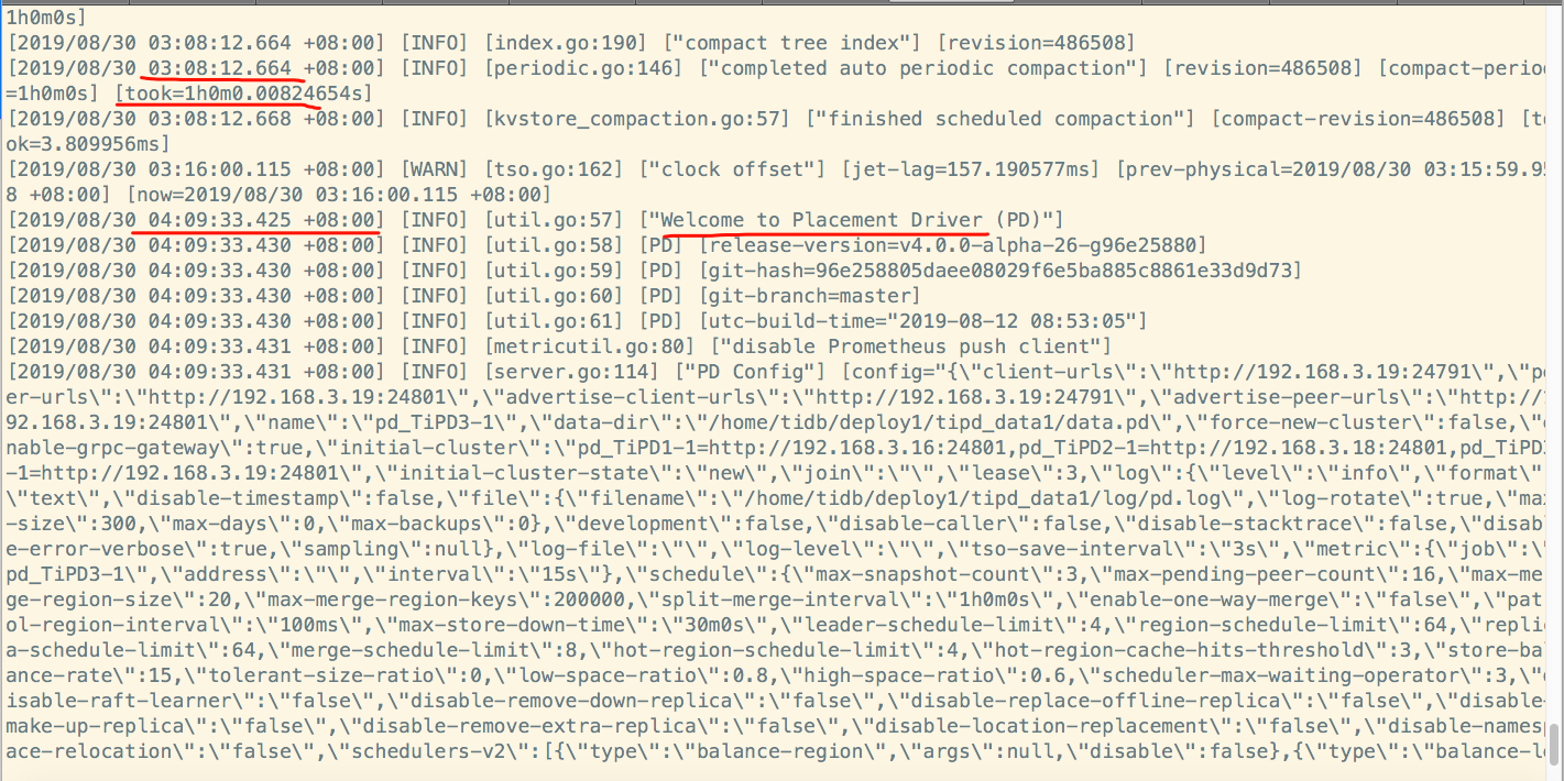 经过查看3.19的pd的日志信息,发现在凌晨1点08分,2点08分,3点08分,数据均进行完成1次自动定期压缩,但是,消耗的时间有点长,长达1小时之久。