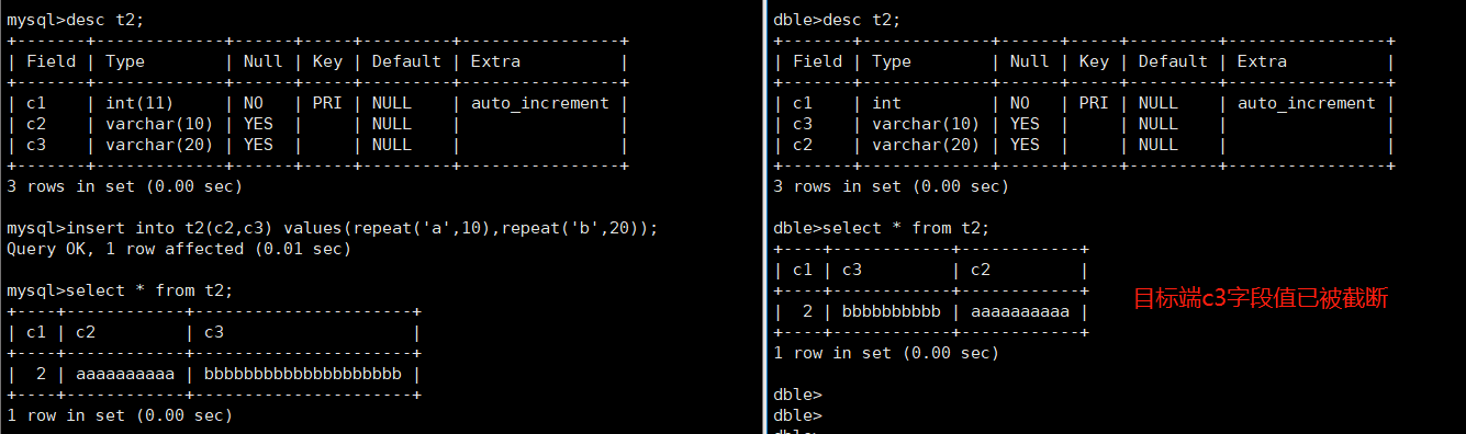 (5)源、目标表字段顺序必须要一致,否则可能会导致数据不一致,两字段同为 varchar 并且长度不相等时,同步任务并不会报错,但写入目标表的值可能会被截断,如下图: