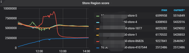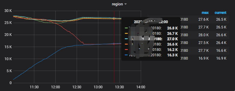 看着region那个图 下面的2个tikv的region数量是往上缓慢增长的趋势,上面的3个是往下走的