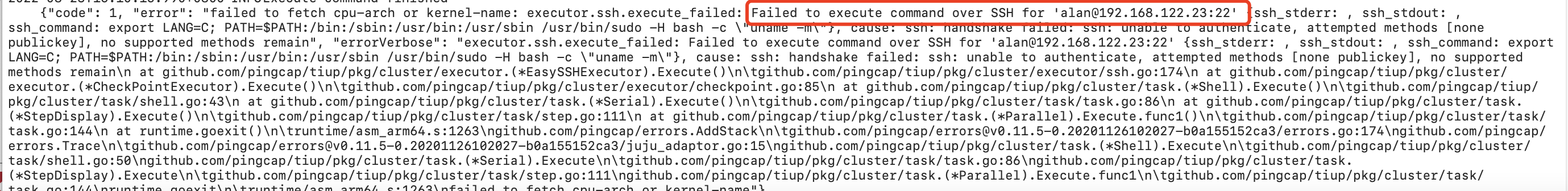 {"code": 1, "error": "failed to fetch cpu-arch or kernel-name: executor.ssh.execute_failed: Failed to execute command over SSH for 'alan@192.168.122.23:22' {ssh_stderr: , ssh_stdout: , ssh_command: export LANG=C; PATH=$PATH:/bin:/sbin:/usr/bin:/usr/sbin /usr/bin/sudo -H bash -c \"uname -m\"}, cause: ssh: handshake failed: ssh: unable to authenticate, attempted methods [none publickey], no supported methods remain", "errorVerbose": "executor.ssh.execute_failed: Failed to execute command over SSH for 'alan@192.168.122.23:22' {ssh_stderr: , ssh_stdout: , ssh_command: export LANG=C; PATH=$PATH:/bin:/sbin:/usr/bin:/usr/sbin /usr/bin/sudo -H bash -c \"uname -m\"}, cause: ssh: handshake failed: ssh: unable to authenticate, attempted methods [none publickey], no supported methods remain\