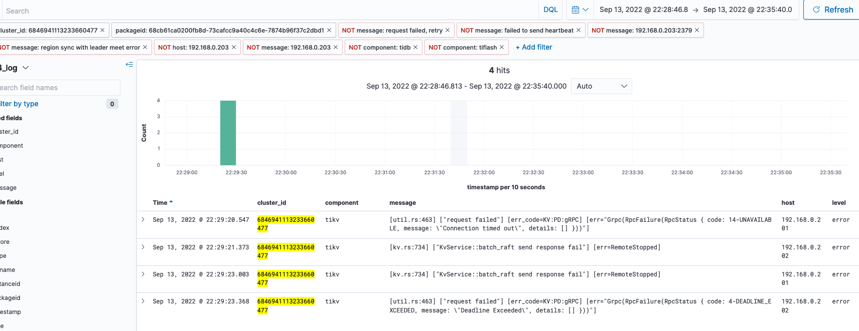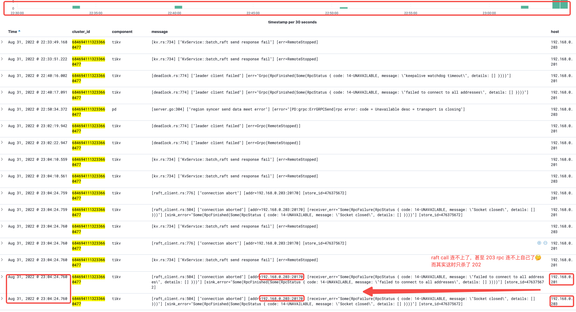 细看 log,用表达式去除一些无用日志后,内容如下,203 rpc 连自己失败了,但其实自己连自己网络应该是没问题的: