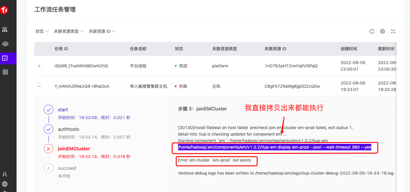 [30130]install filebeat on host failed precheck join em cluster em-prod failed, exit status 1.