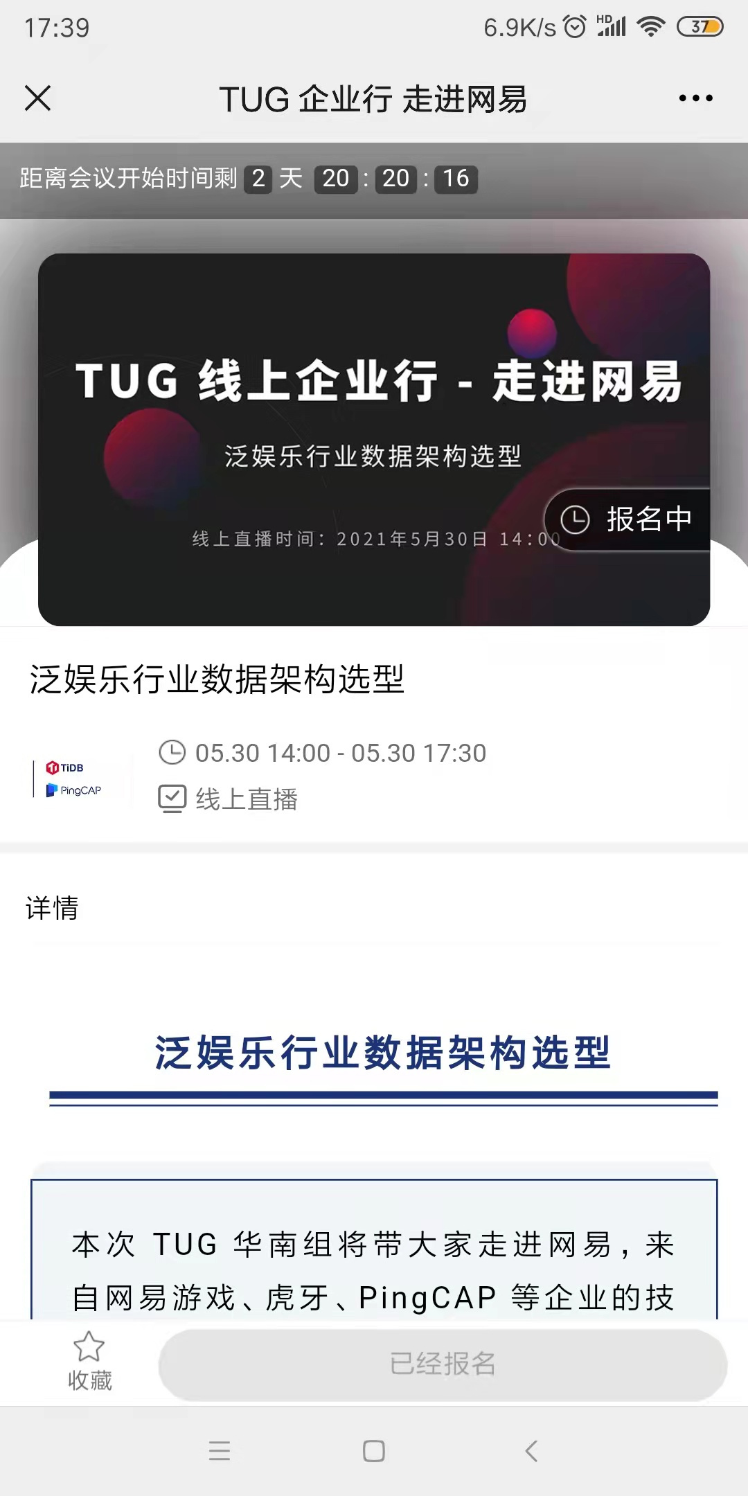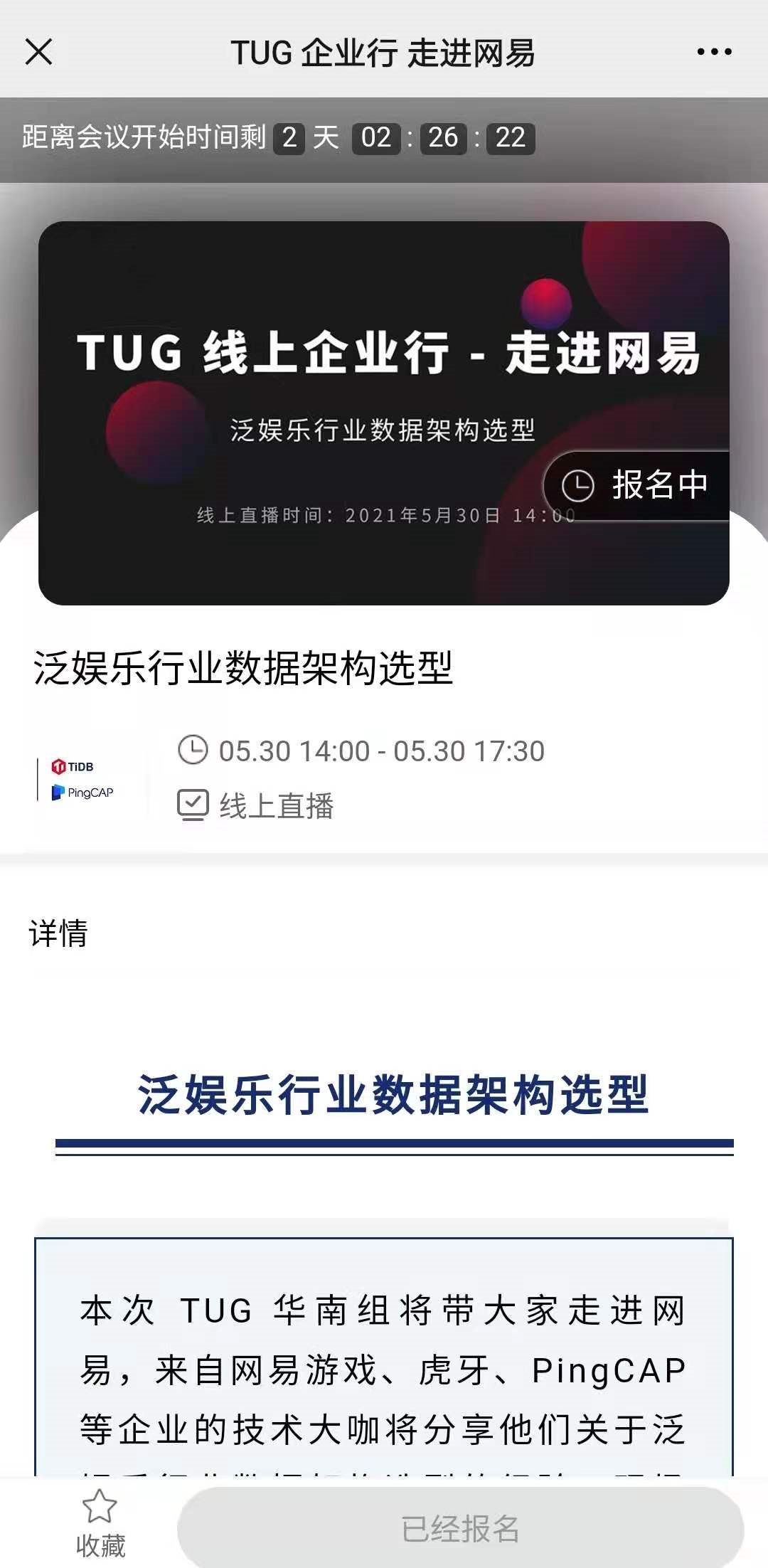 5 月 30 日 TUG 企业行 | 走进网易 将采用线上直播的方式进行,届时来自网易游戏、虎牙、PingCAP 等企业的技术大咖将分享他们在分布式数据库和实时数据业务方面的实践经验,现场还将围绕「泛娱乐行业数据架构选型」这一话题进行圆桌讨论。欢迎大家扫描下方二维码报名,参与线上直播互动。