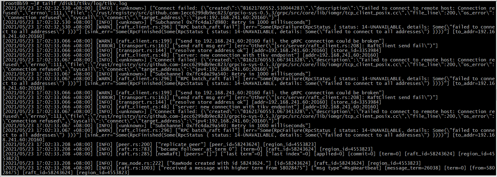 其他 TiKV 的日志中出现链接这个故障 TiKV 的报错,符合预期,因为这个 TiKV 确实异常了 ~
