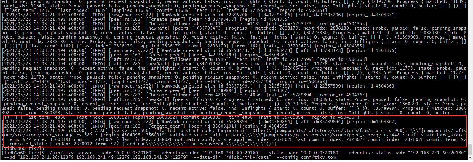 tidb集群中某个tikv节点192.168.241.60 内存故障(某1块内存条故障,拆除故障的内存条,启动) 启动后 TIKV无法启动