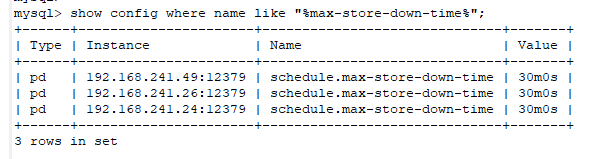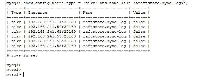 1、 show config where type = 'tikv' and name like '%raftstore.sync-log%'