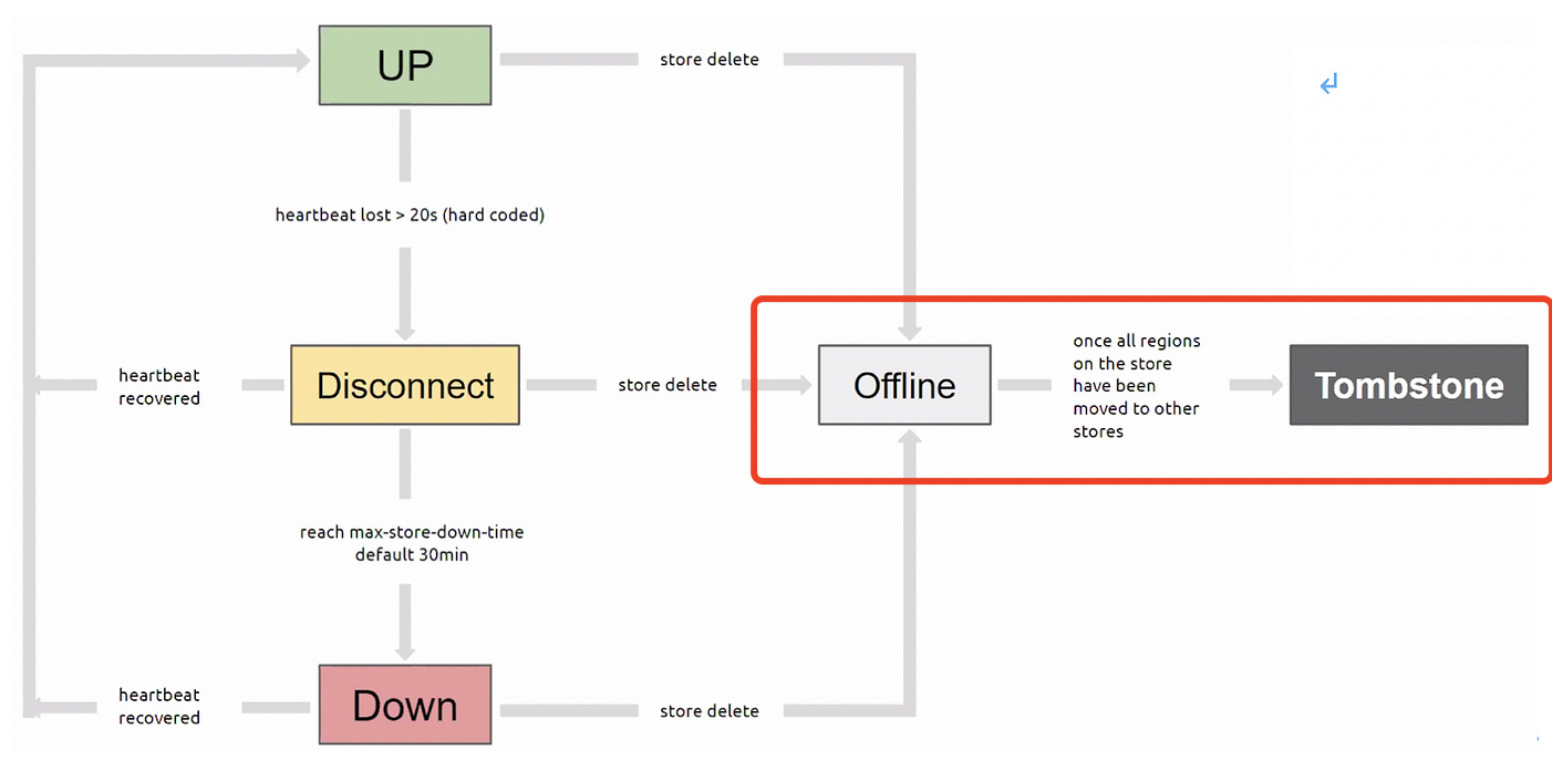 这个节点如果使用 pd-ctl delete store 了,那么当该节点中的 region 副本在其他 store 补足后,会变成 tombstone。如果是这样那这个现象是符合预期的: