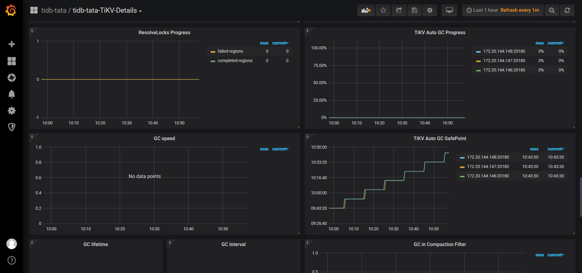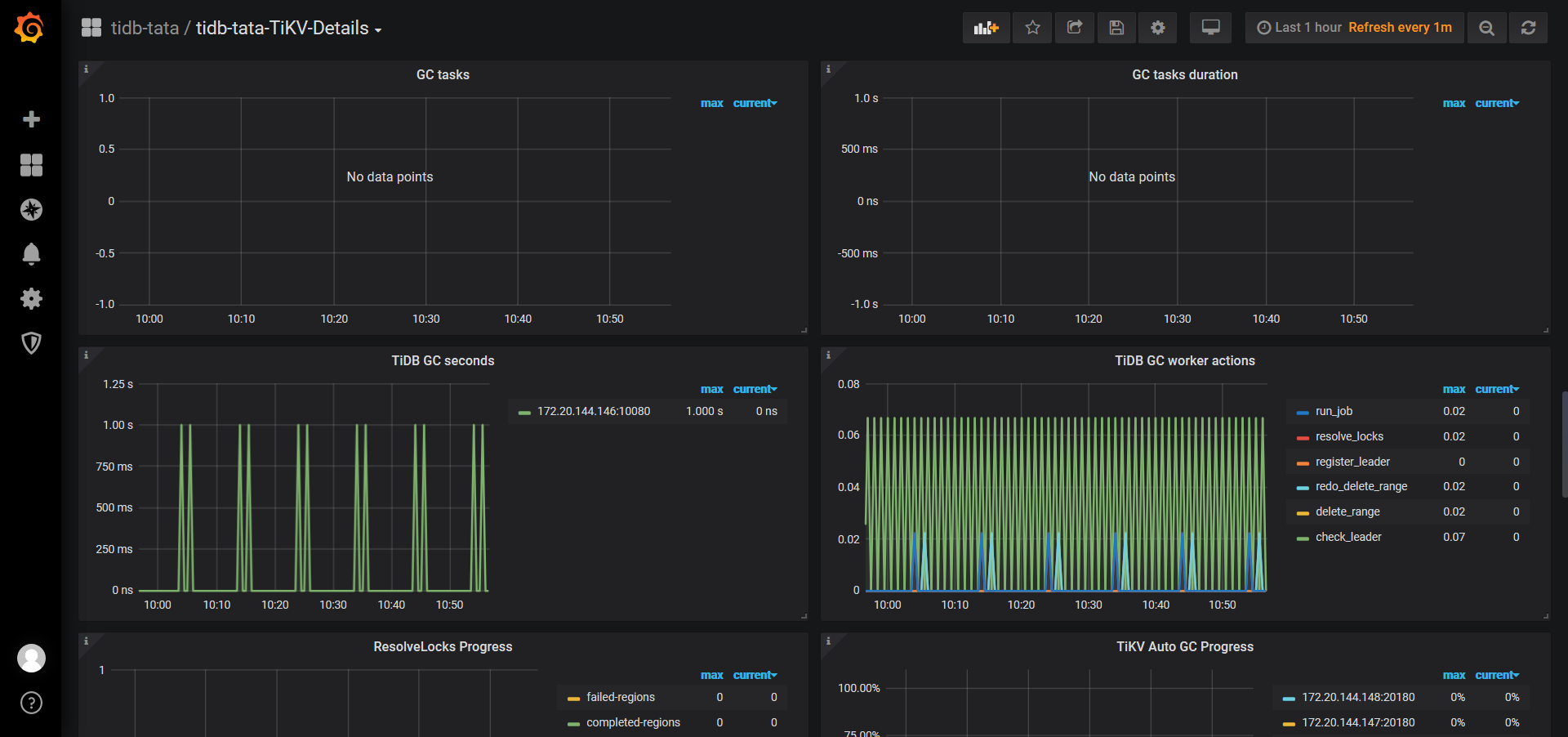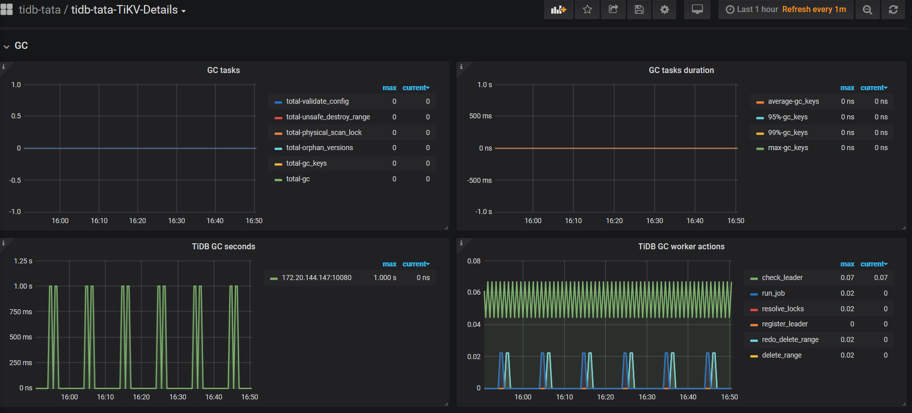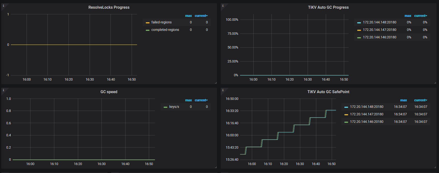 如果发现这段时间一直在 resolve locks 或者 delete ranges,说明 GC 进程是正常的