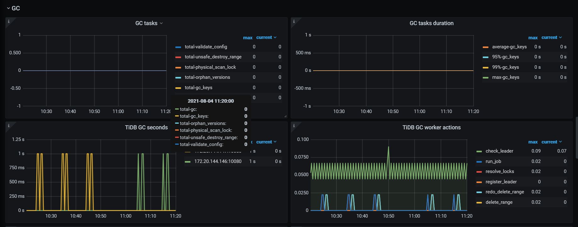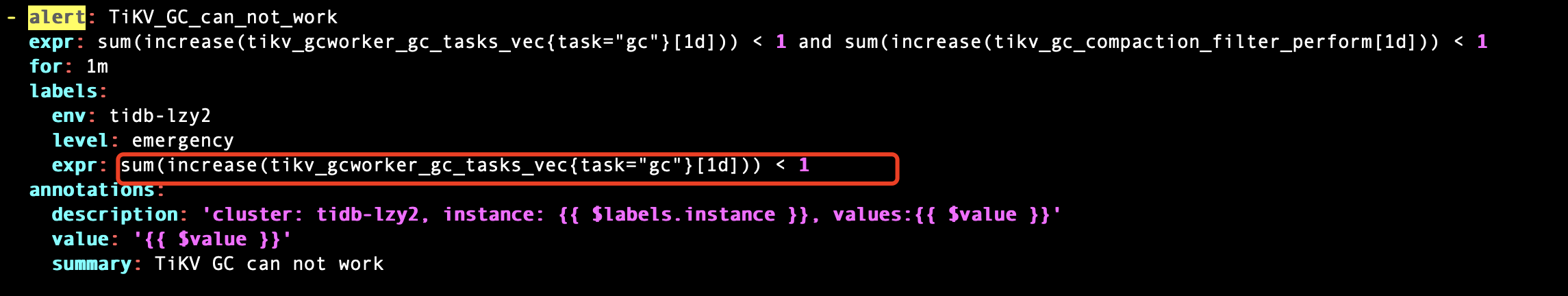 sum(increase(tikv_gcworker_gc_tasks_vec{task="gc"}[1d])) < 1 and sum(increase(tikv_gc_compaction_filter_perform[1d])) < 1