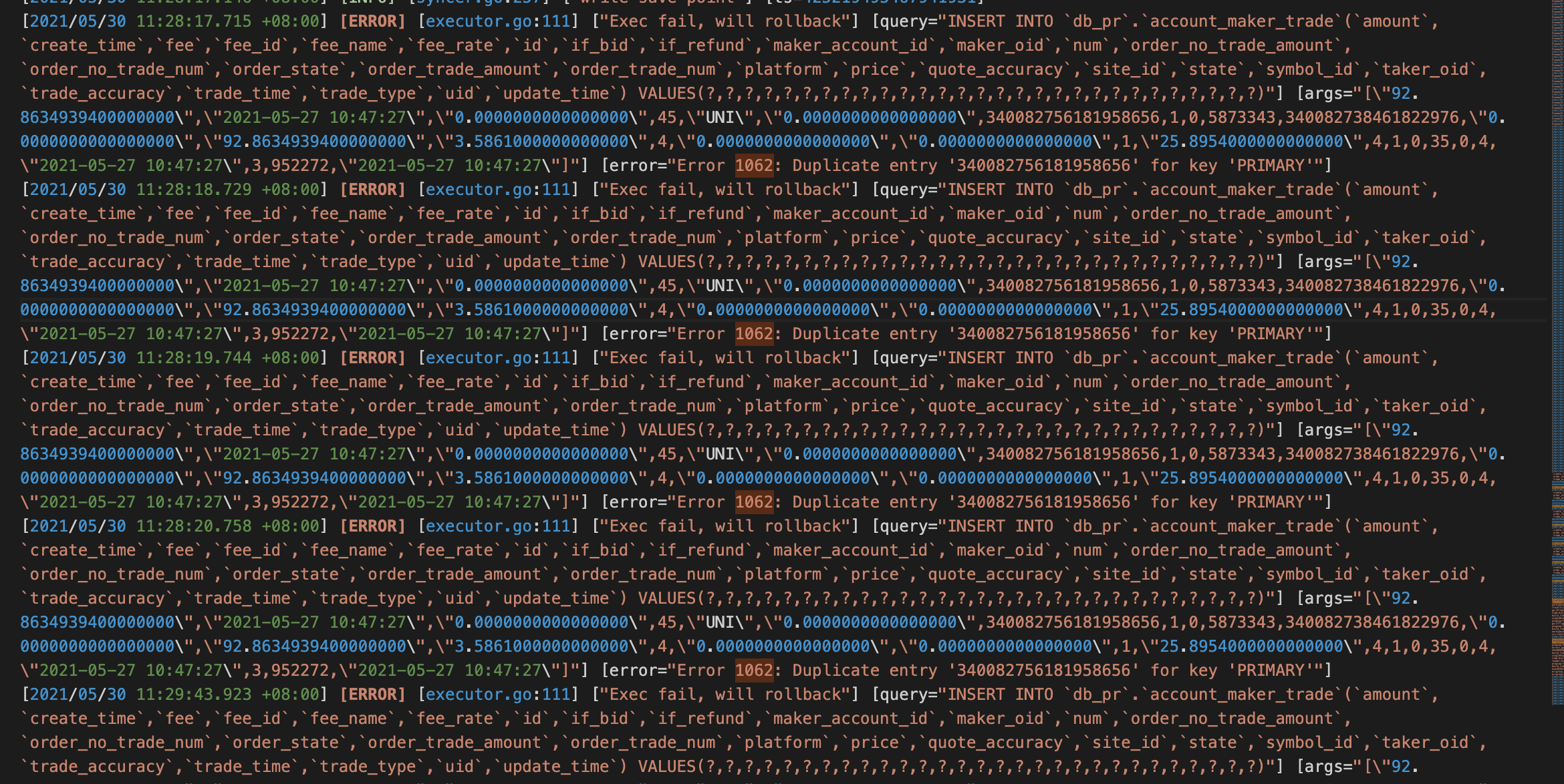 1、部署过多次drainer,但是都是同步失败,且失败原因都是 error="Error 1062: Duplicate entry '340082756181958656' for key 'PRIMARY'"。