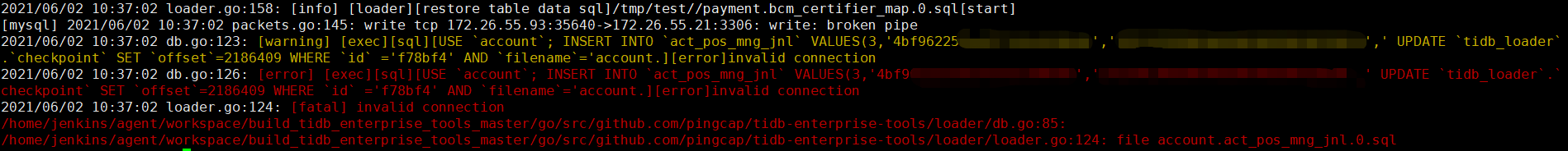 重复跑了几次,每次插入报错的数据都不一样,但是报错信息都是 [error]invalid connection
