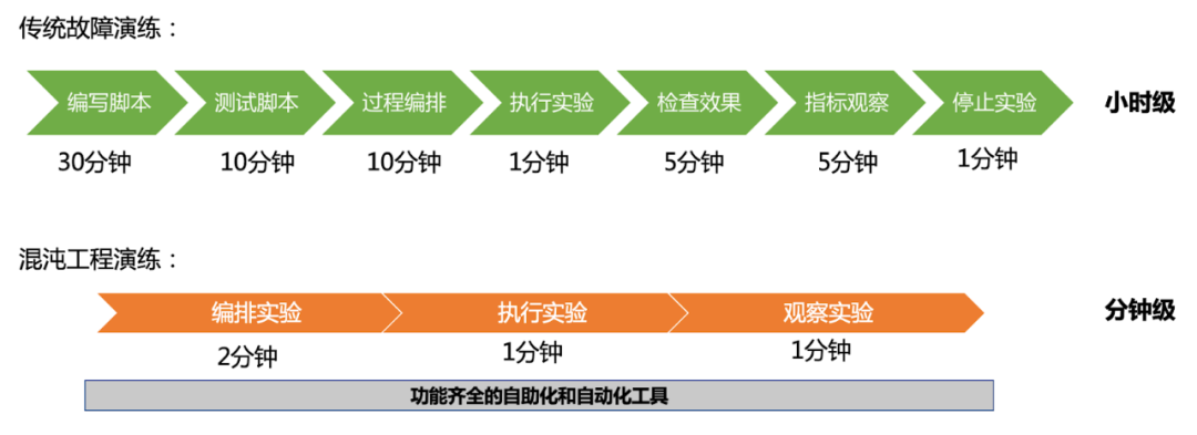 从腾讯互娱的统计数据来看,通过混沌工程与传统的故障演练进行对比,混沌工程的效率至少提升了 10 倍以上,这就是做混沌工程最大的收益。