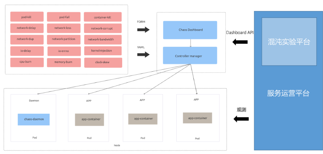 为了充分的发挥 Chaos Mesh 的优势,腾讯互娱混沌工程团队把它集成到现有的运营平台,在每个 TKE 集群都部署了 Chaos Mesh,通过Chaos Mesh提供的dashboard API 来创建、执行、销毁实验,同时基于当前运营平台的能力来观测实验效果,权限上也与现有的运营平台进行了对接。