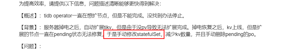 【背景】:服务器掉电之后,自动扩展tikv,但是由于没pv导致无法扩展完成。掉电恢复之后,kv上线,但是扩展的节点一直在pending状态无法修复,于是手动修改statefulSet,减少kv数量,并且手动删除pending的po。